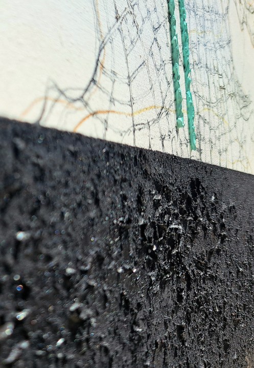 In the crack of the space, 130×160 cm pencils, liquid glass, oil paints, on canvas