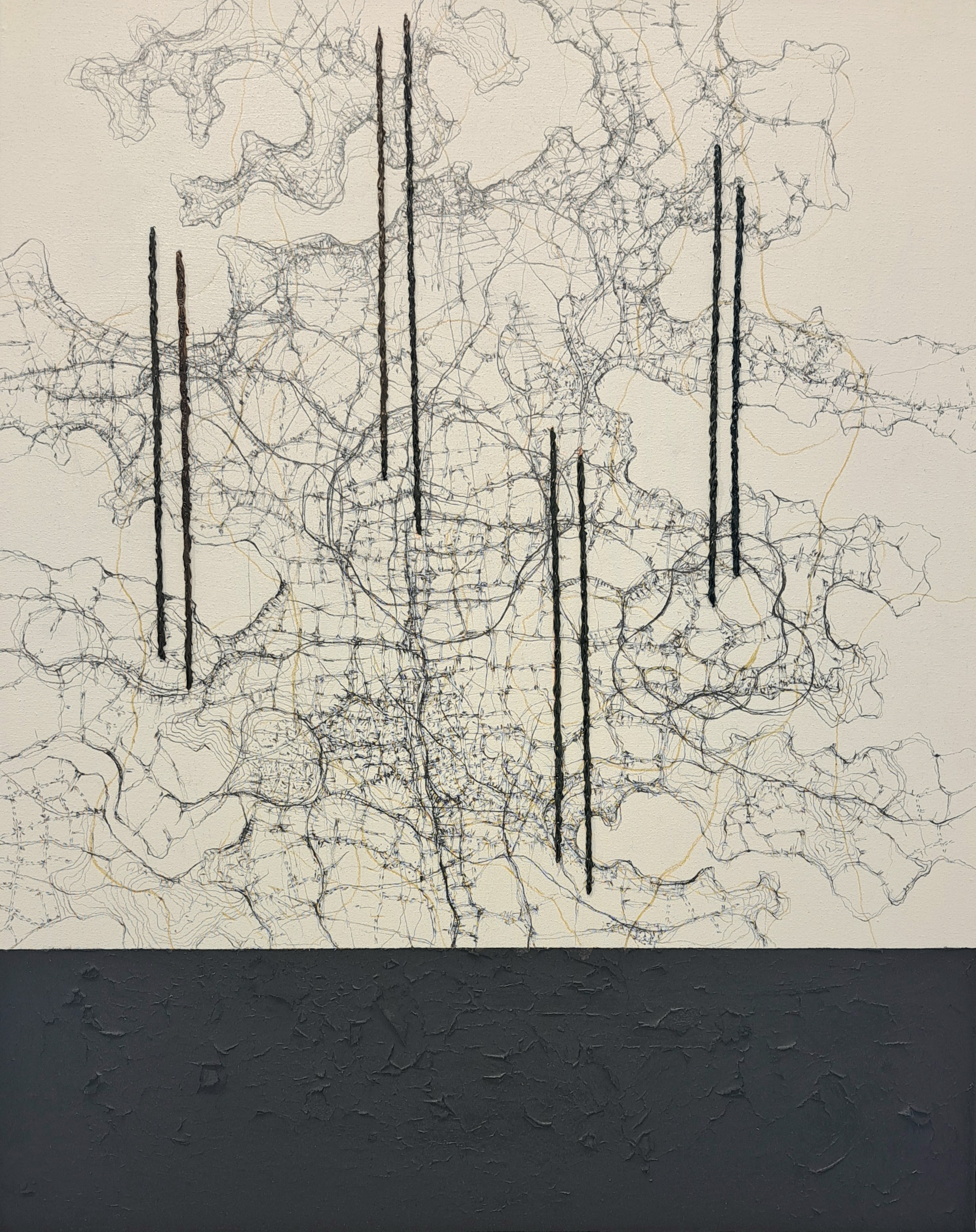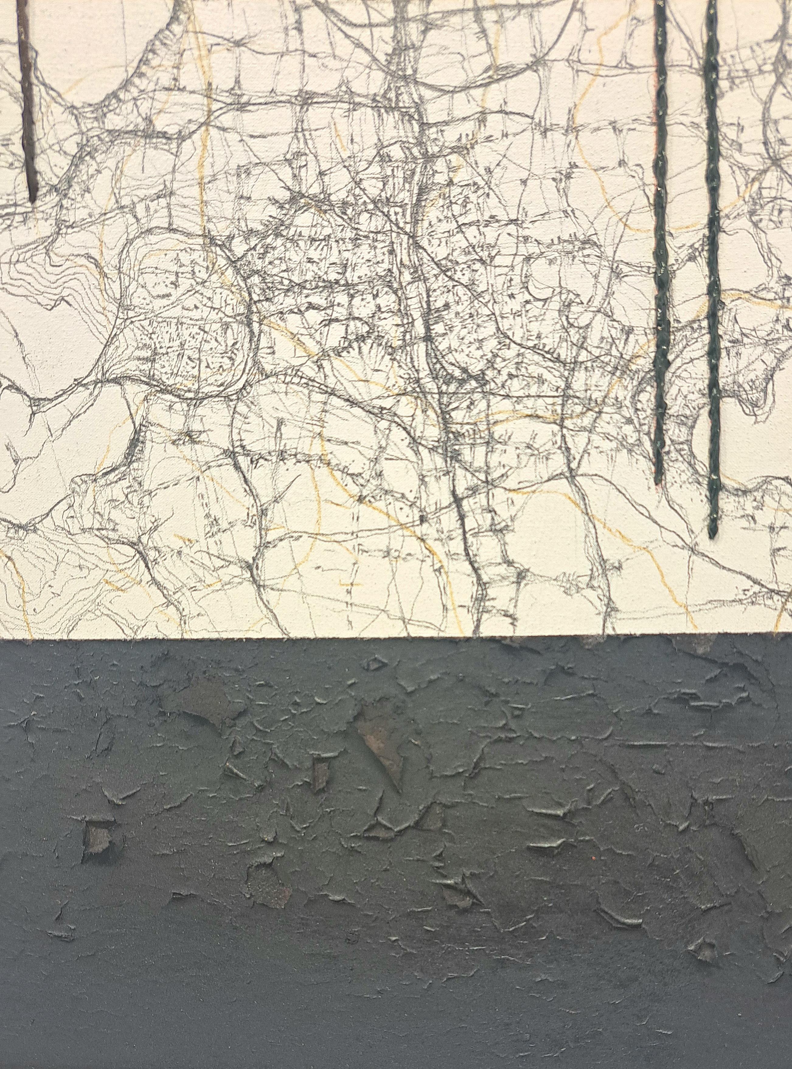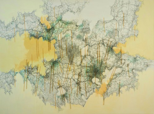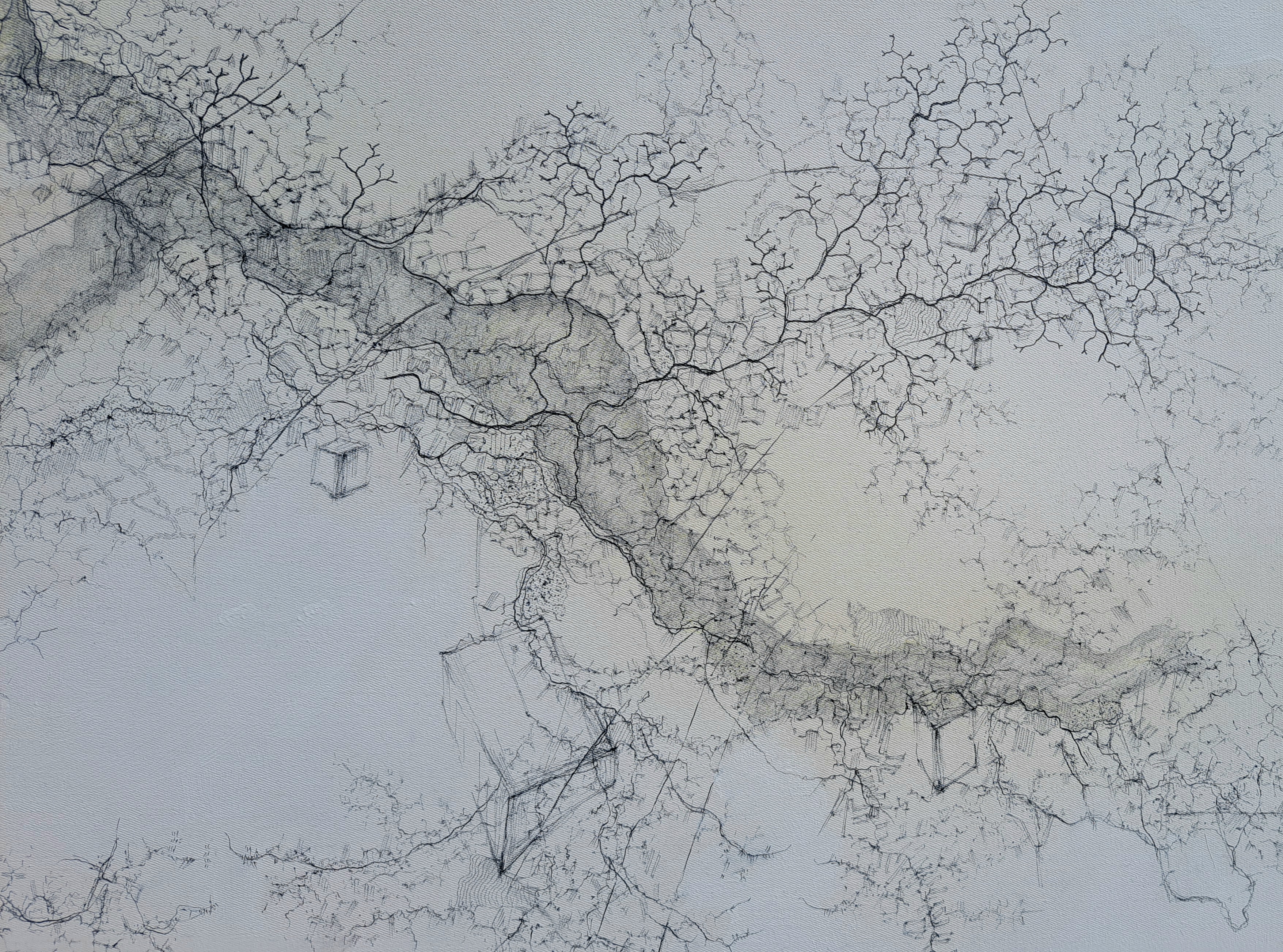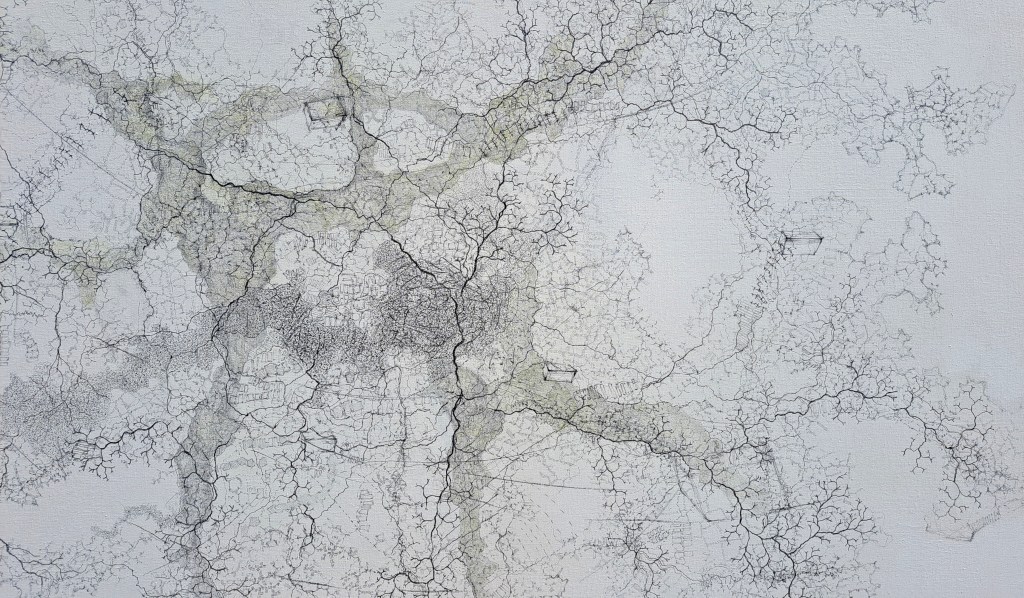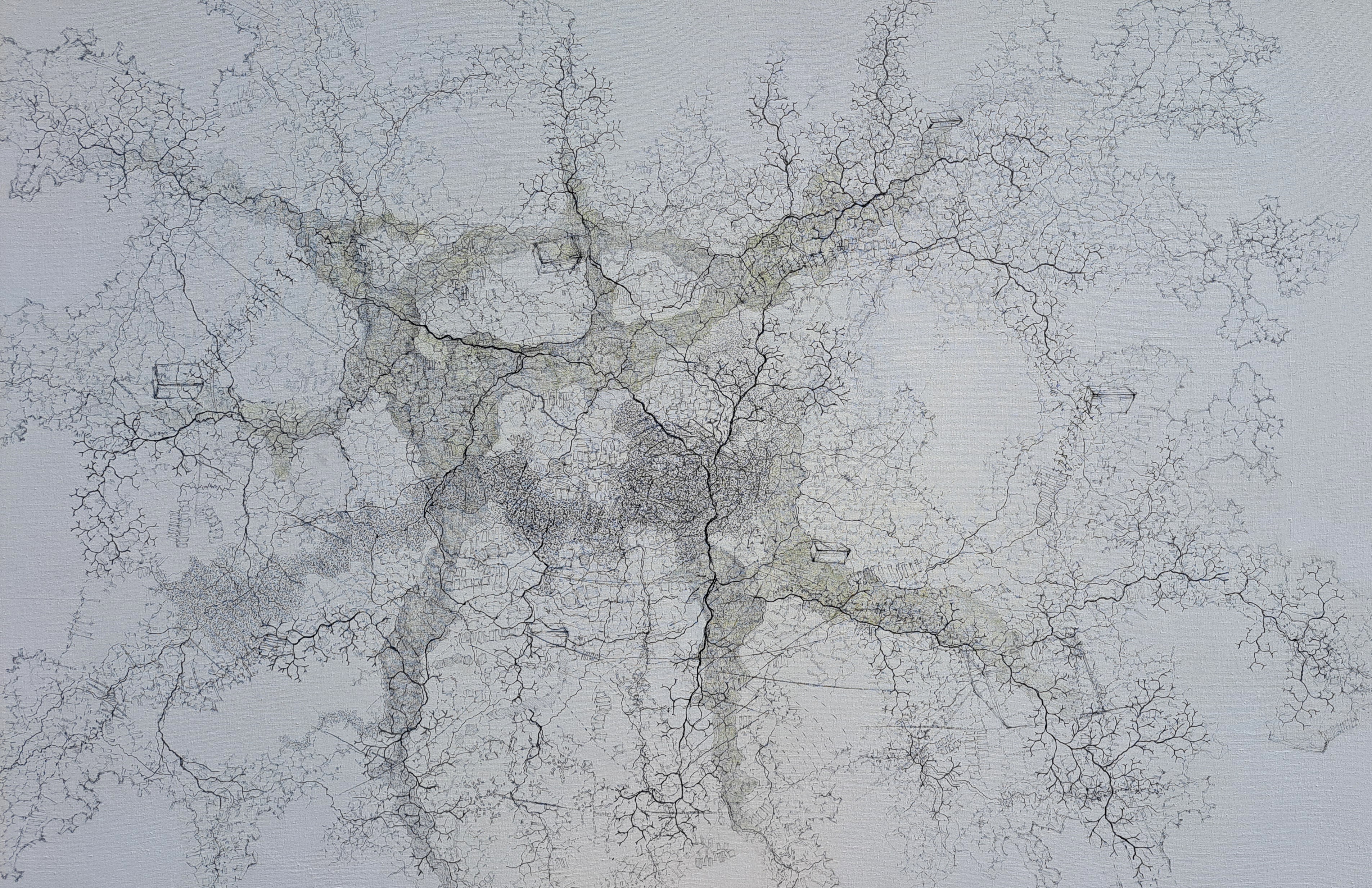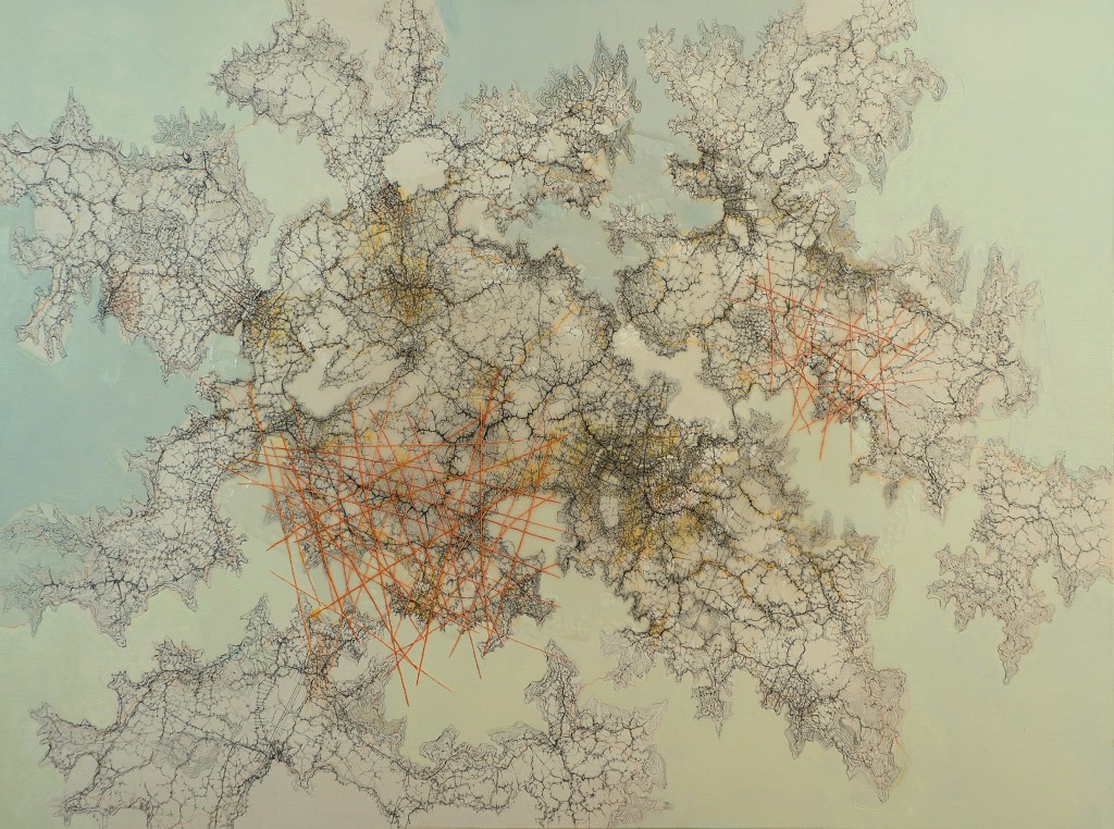 In the crack of the space, 130×160 cm pencils, liquid glass, oil paints, on canvas