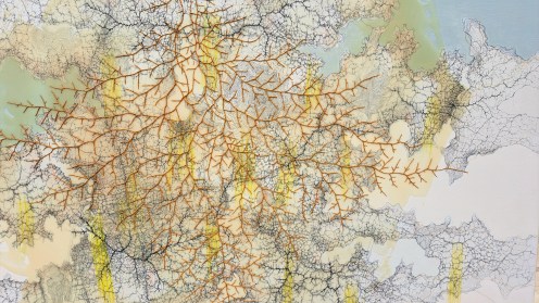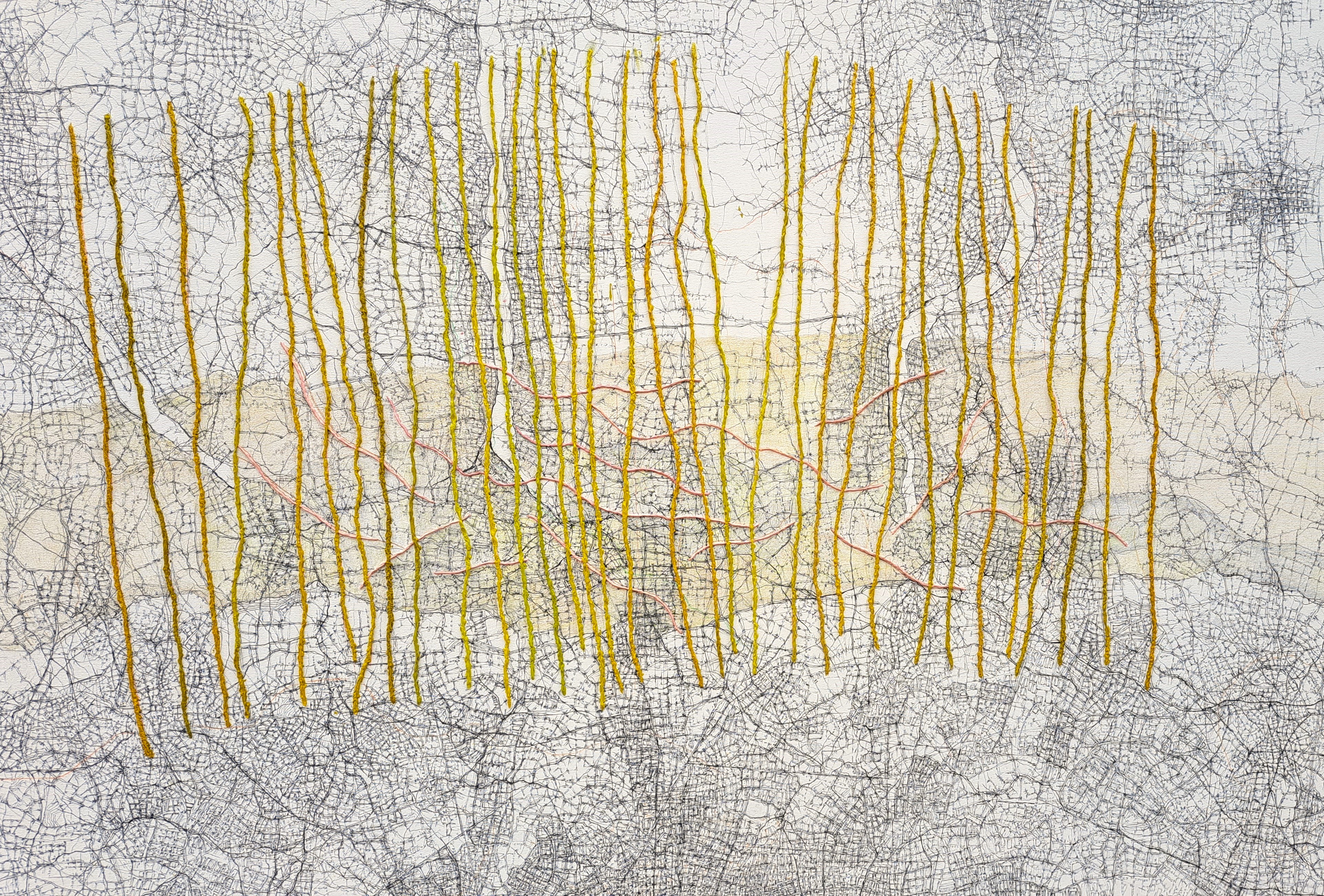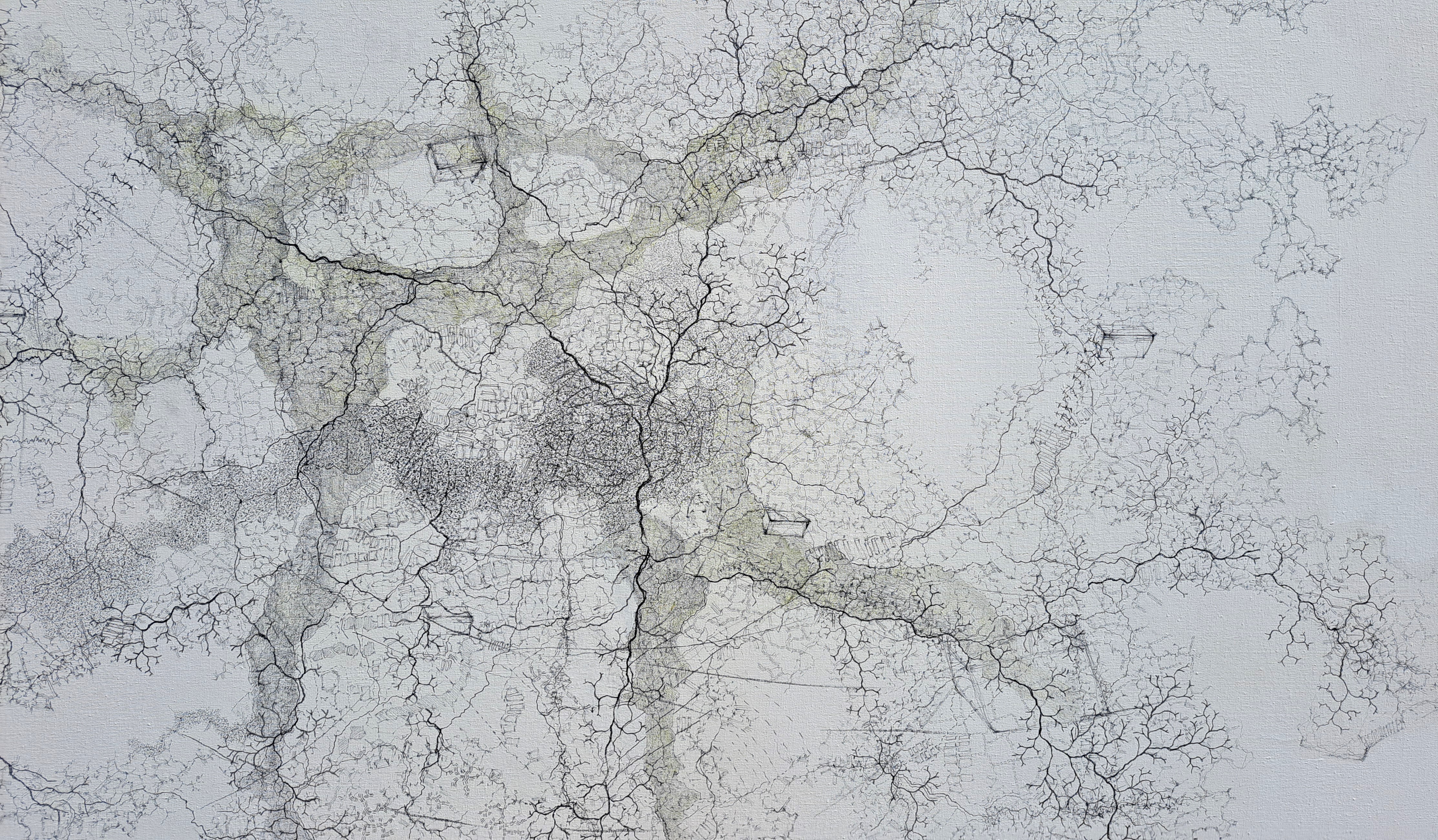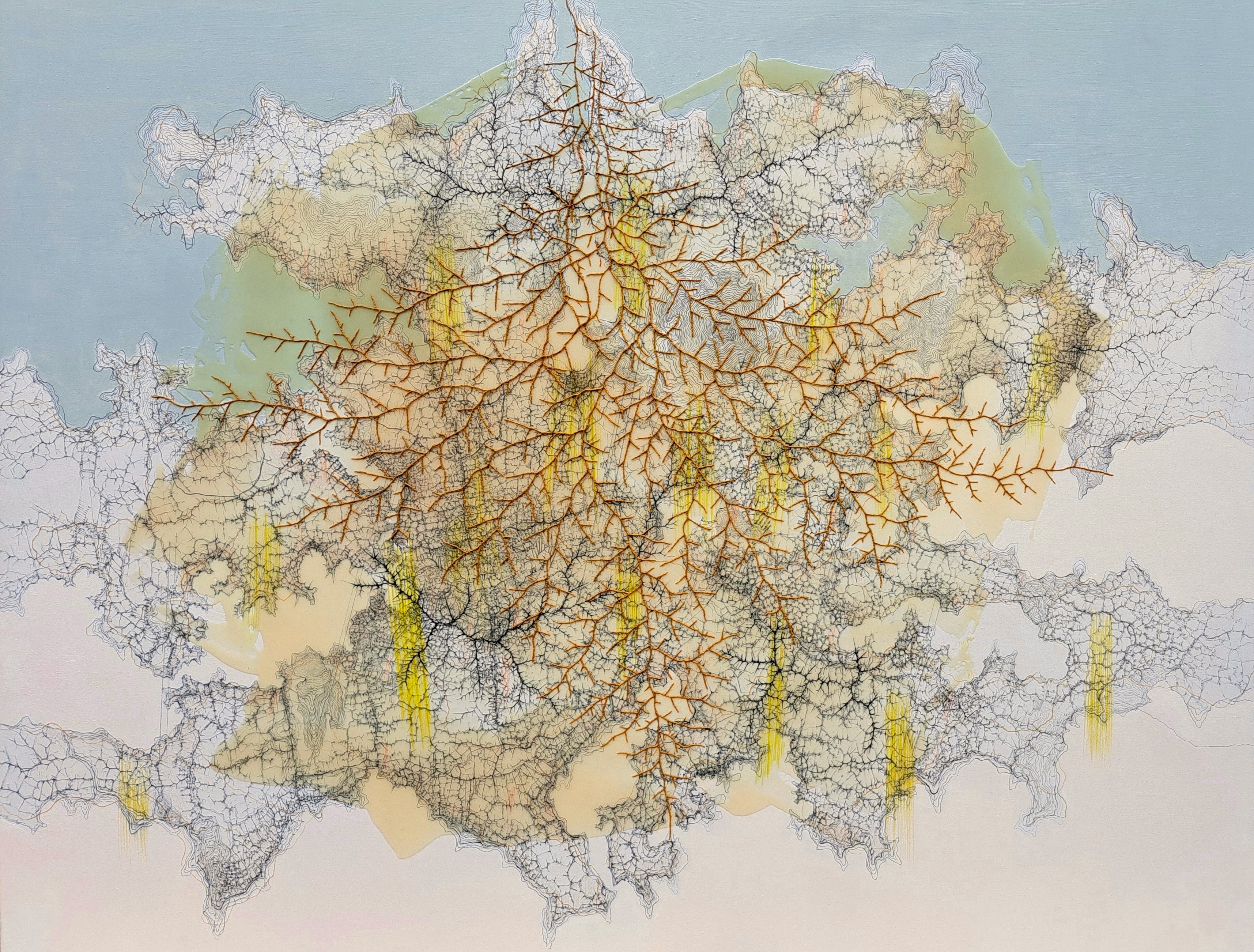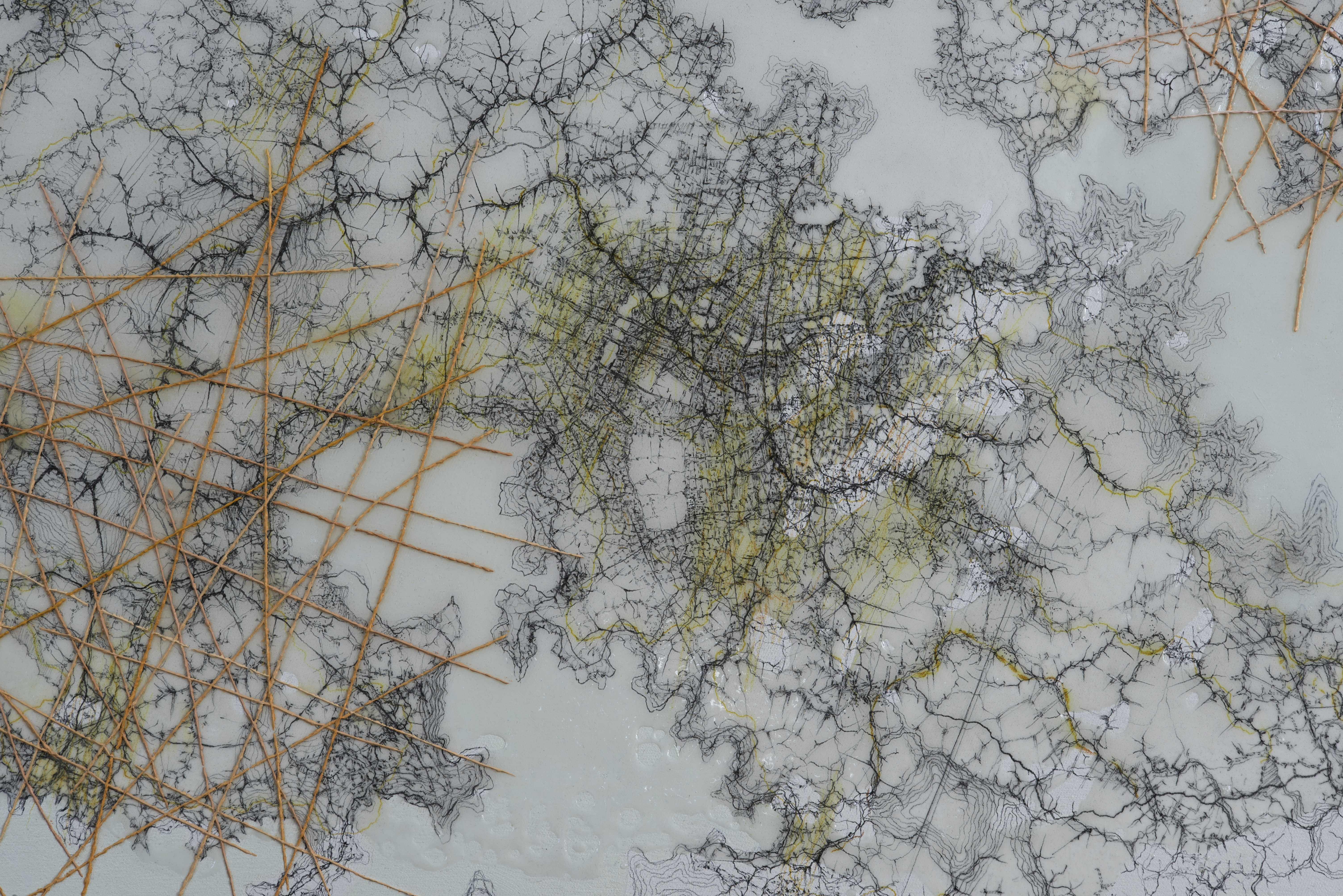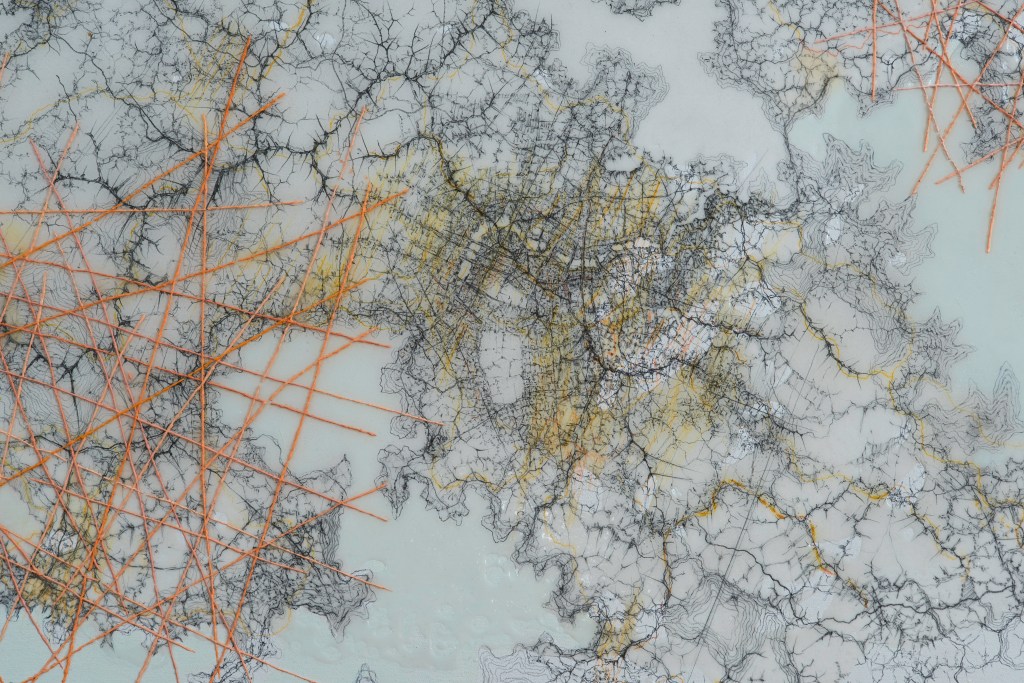 In the crack of the space, 130×160 cm pencils, liquid glass, oil paints, on canvas