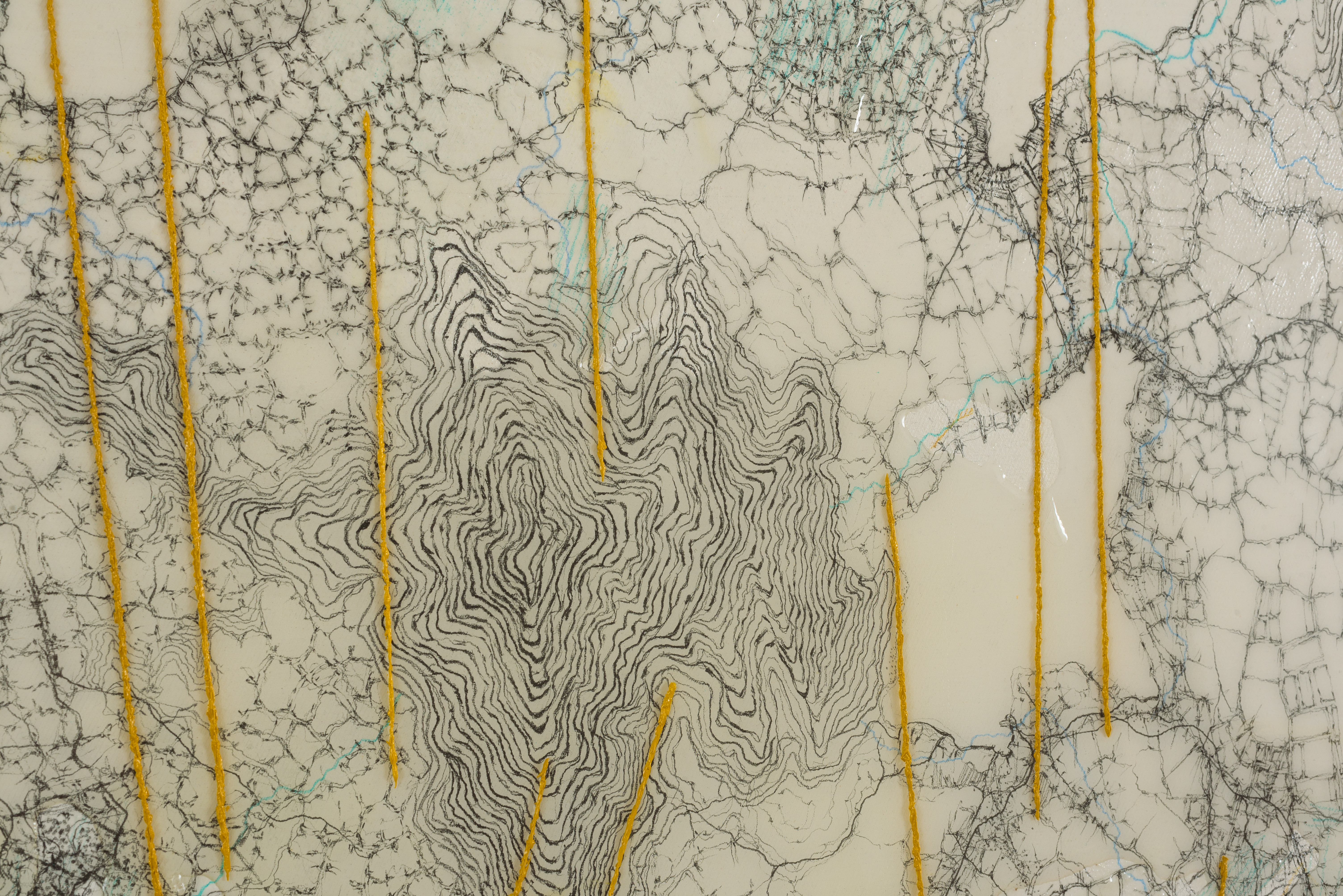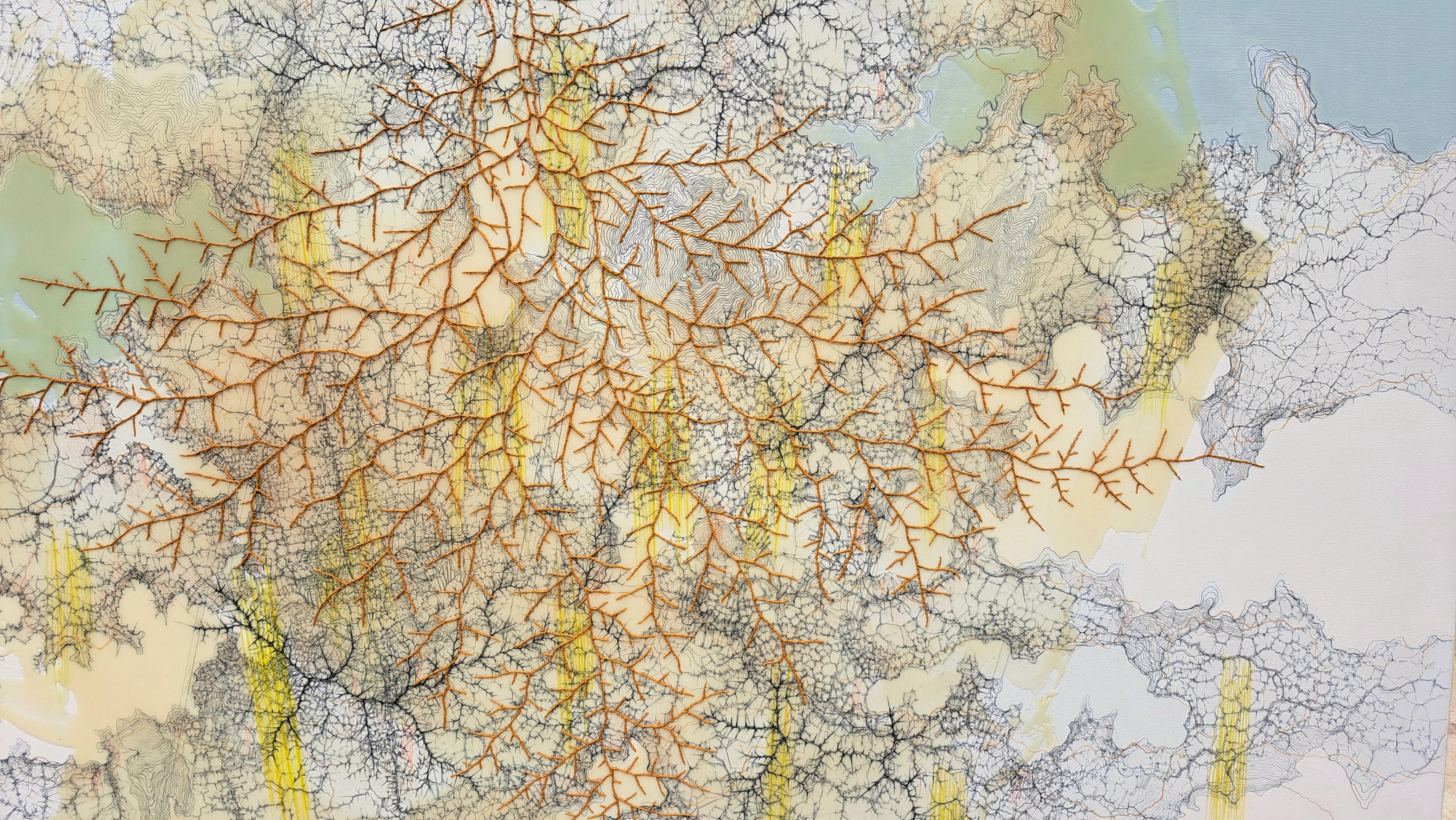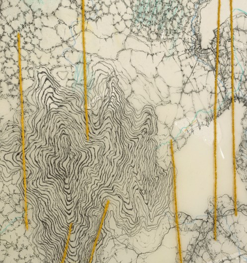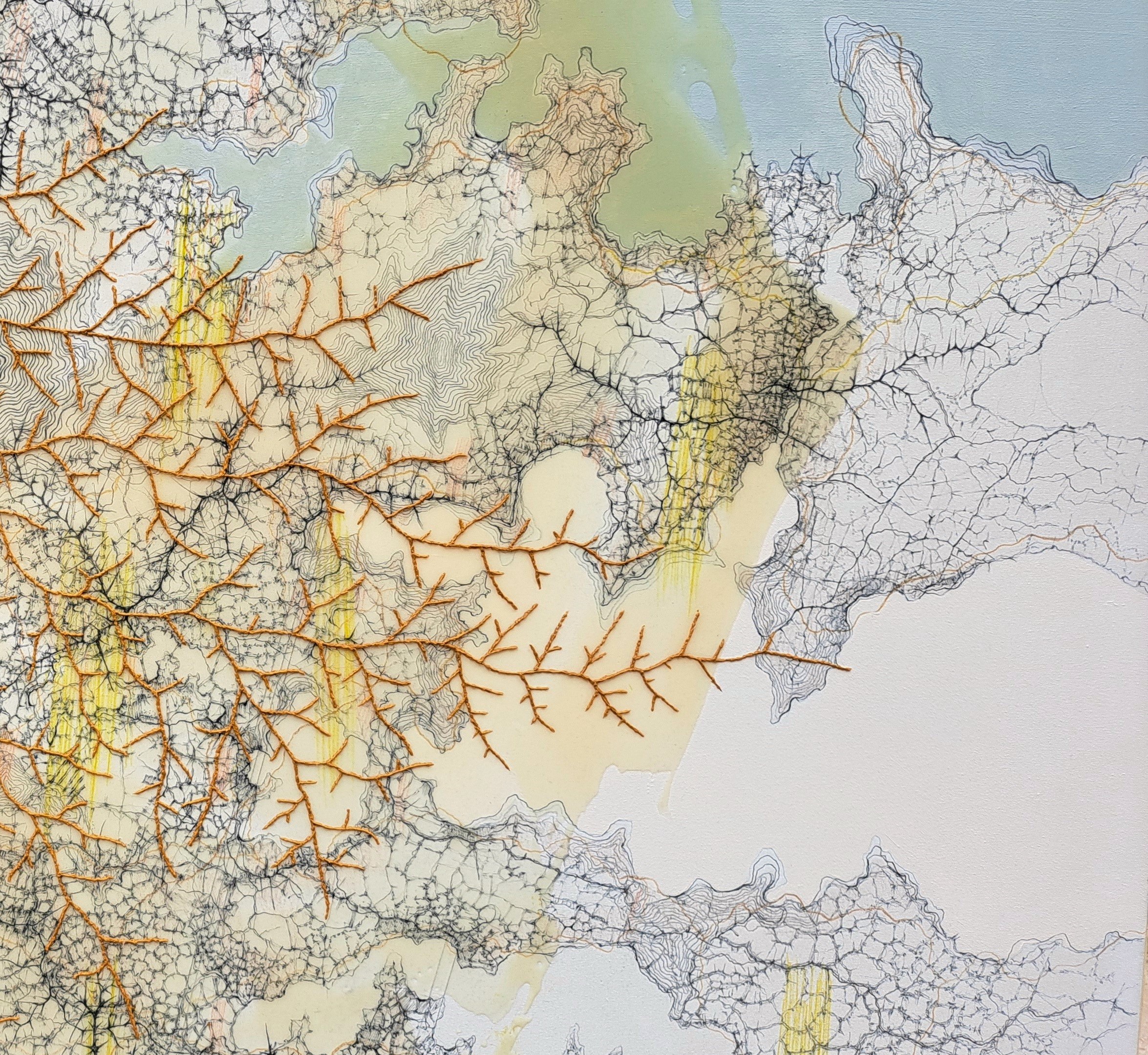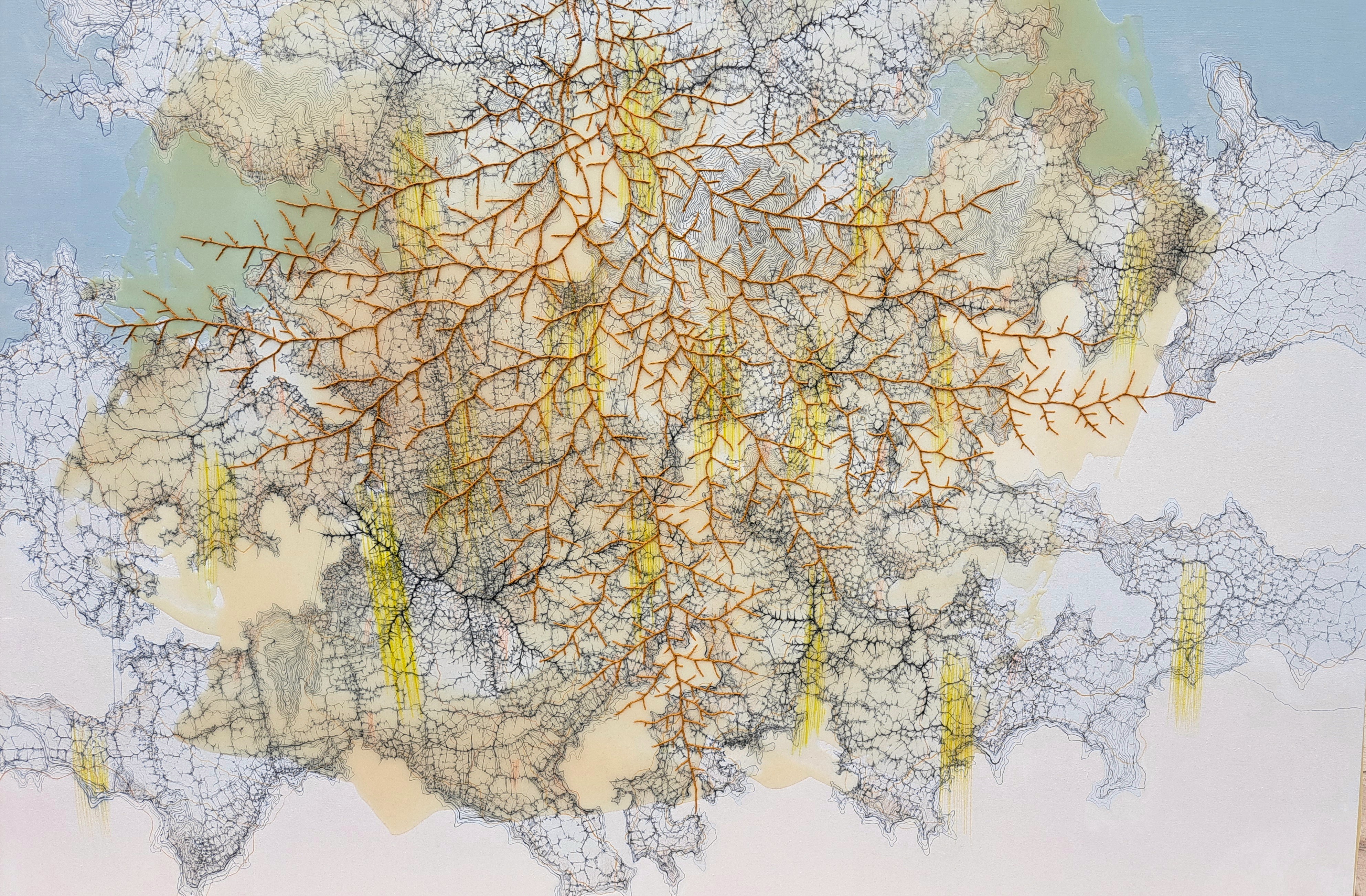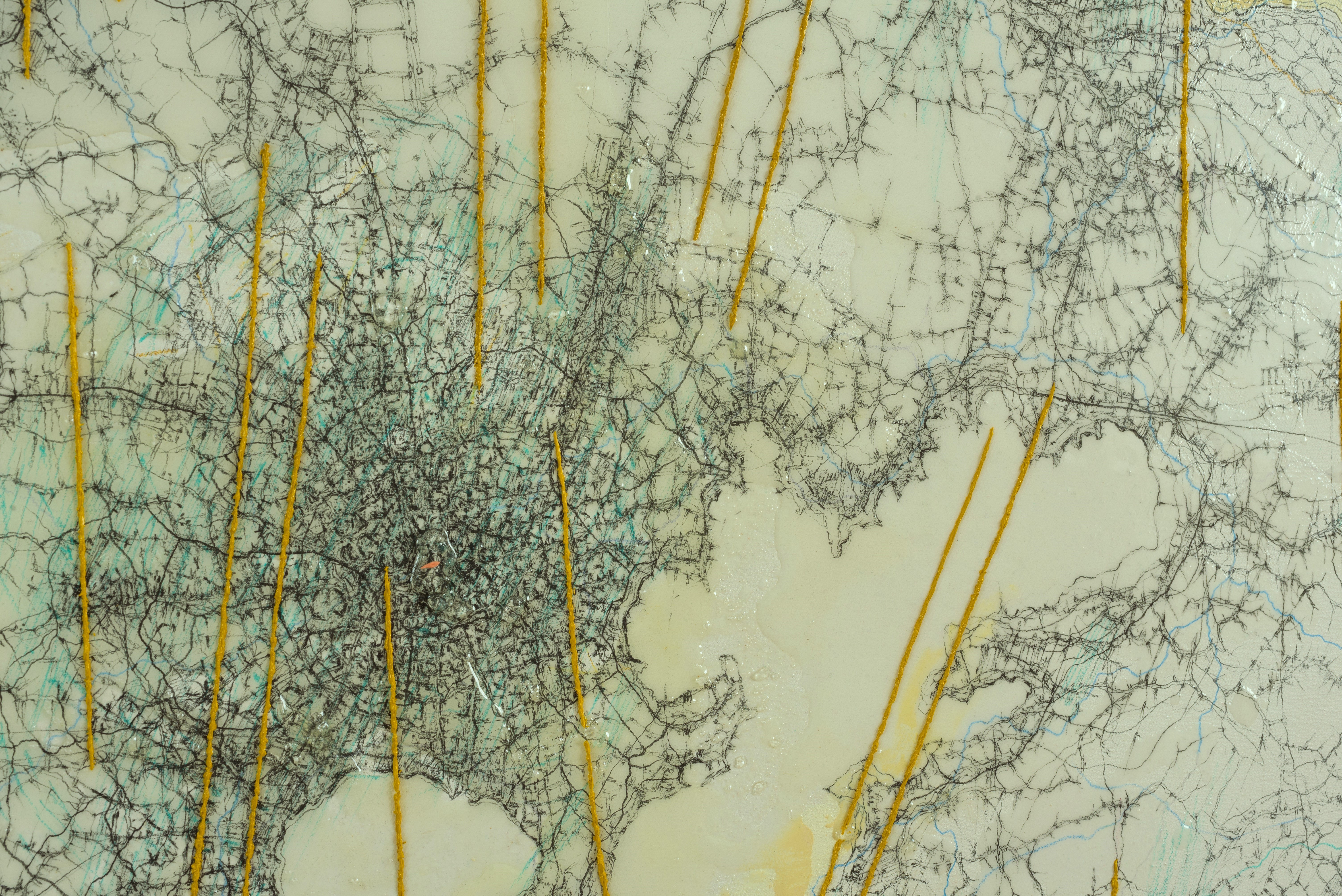 In the crack of the space, 130×160 cm pencils, liquid glass, oil paints, on canvas