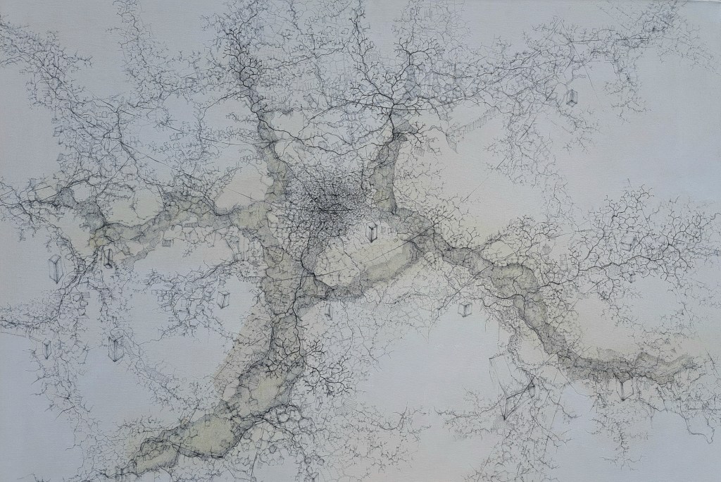 Spatial narratives, 150×180 cm pencils, oil paints, on canvas