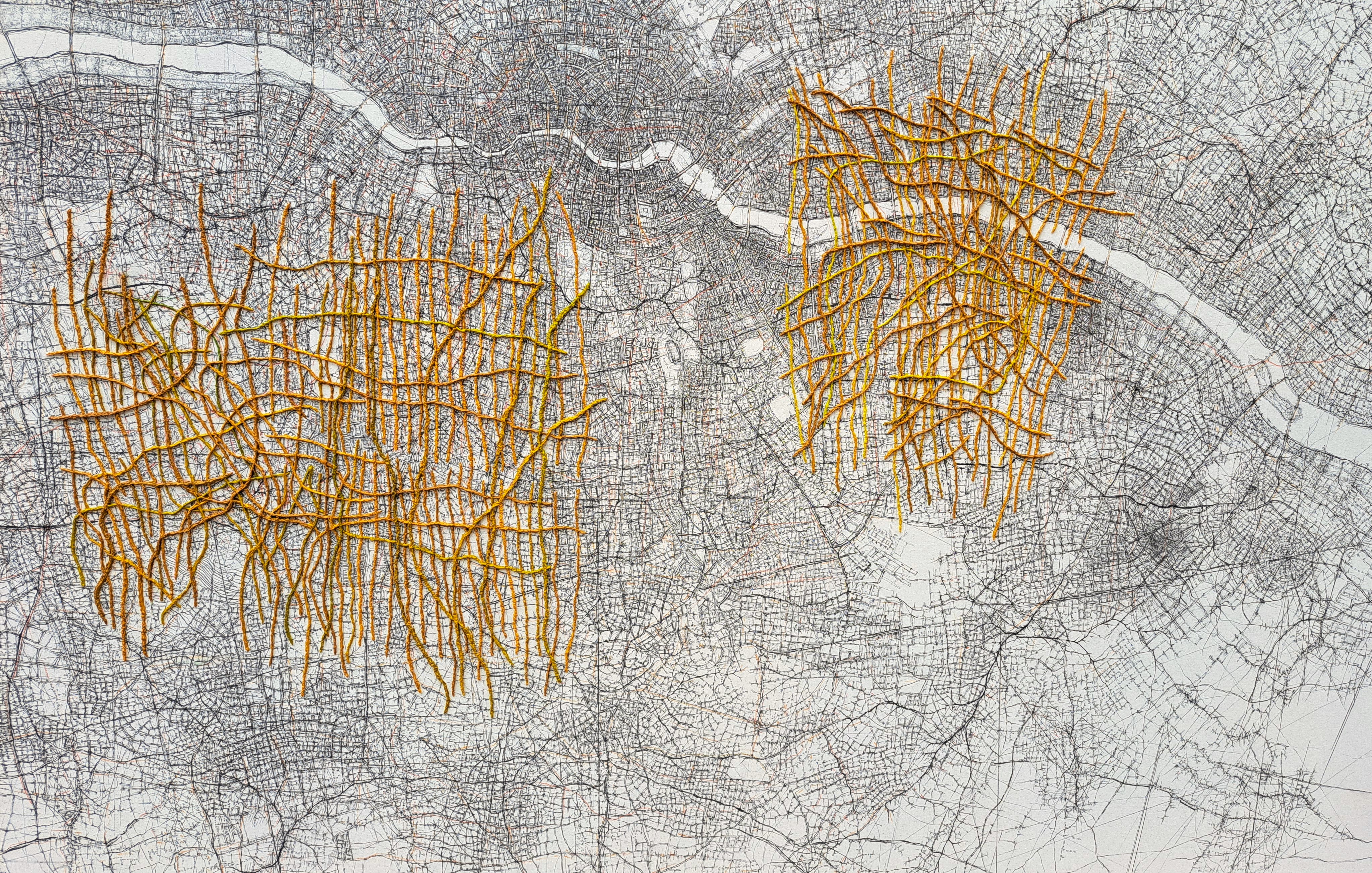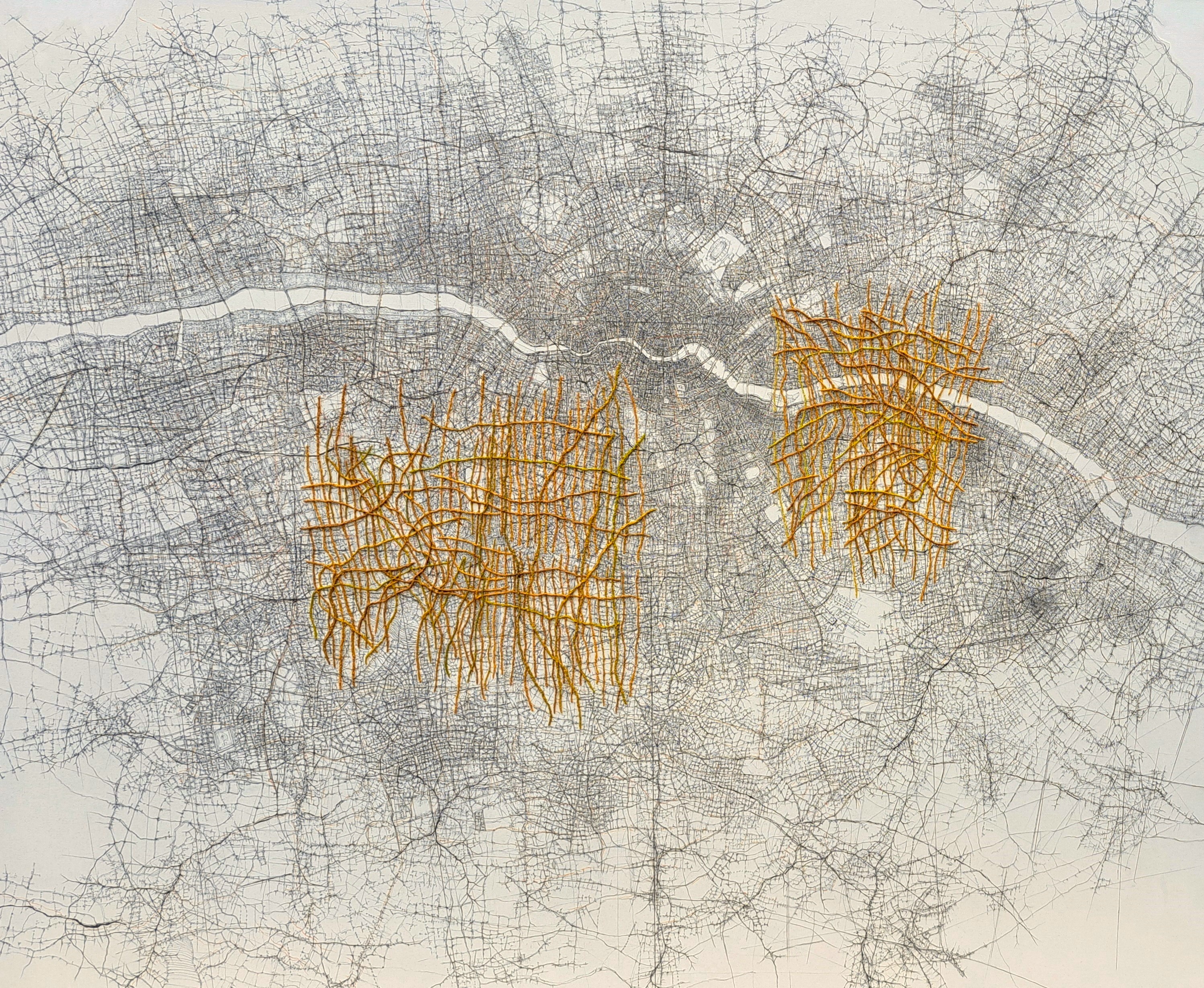 Acid Rain, 130×160 cm pencils, liquid glass, oil paints, on canvas